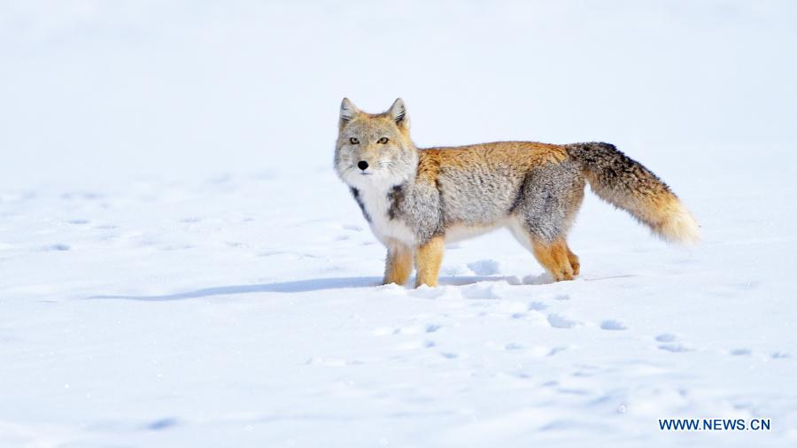 JIUQUAN, 25 janvier (Xinhua) -- Un renard tibétain est photographié après une chute de neige dans le district autonome kazakh d'Aksay, à Jiuquan, dans la province chinoise du Gansu (nord-ouest), le 23 janvier 2021. (Photo : Gao Hongshan)