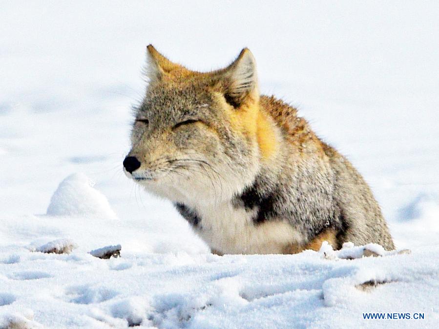 JIUQUAN, 25 janvier (Xinhua) -- Un renard tibétain est photographié après une chute de neige dans le district autonome kazakh d'Aksay, à Jiuquan, dans la province chinoise du Gansu (nord-ouest), le 23 janvier 2021. (Photo : Gao Hongshan)
