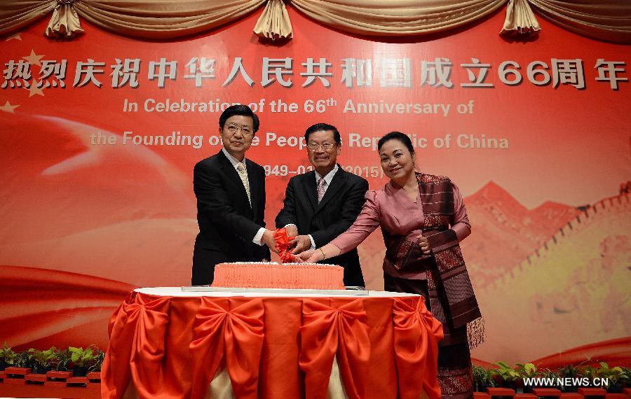 L'ambassadeur de Chine au Laos, Guan Huabing (G), a donnée une réception à sa résidence à Vientiane à l'occasion du 66e anniversaire de la fondation de la République populaire de Chine, le 24 septembre 2015.(Xinhua/Liu Ailun)
