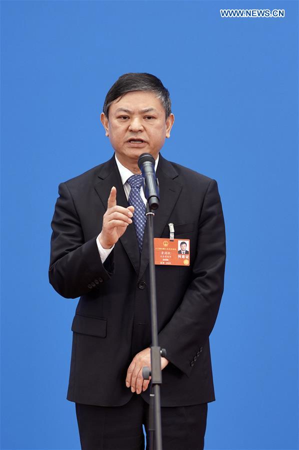 BEIJING, 25 mai (Xinhua) -- Huang Runqiu, ministre chinois de l'Ecologie et de l'Environnement, accorde une interview par liaison vidéo à l'issue de la deuxième réunion plénière de la troisième session de la 13e Assemblée populaire nationale, au Grand Palais du Peuple, à Beijing, capitale chinoise, le 25 mai 2020. (Photo : Cai Yang)