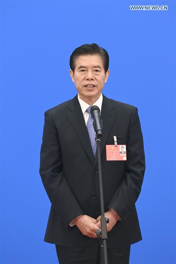 BEIJING, 25 mai (Xinhua) -- Zhong Shan, ministre chinois du Commerce, accorde une interview par liaison vidéo à l'issue de la deuxième réunion plénière de la troisième session de la 13e Assemblée populaire nationale, au Grand Palais du Peuple, à Beijing, capitale chinoise, le 25 mai 2020. (Photo : Chen Yehua)