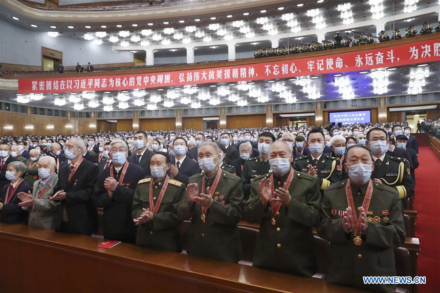 BEIJING, 23 octobre (Xinhua) -- Une réunion marquant le 70e anniversaire de l'entrée des Volontaires du peuple chinois (VPC) en République populaire démocratique de Corée (RPDC) pour combattre dans la Guerre de résistance à l'agression américaine et d'aide à la RPDC s'est tenue au Grand Palais du Peuple à Beijing, capitale chinoise, le 23 octobre 2020. (Photo : Liu Weibing)