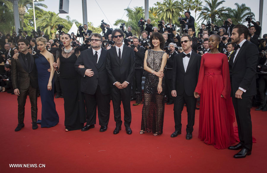 Les membres du jury, Guillermo del Toro, Sienna Miller, Rossy de Palma, Xavier Dolan, Sophie Marceau, Jake Gyllenhaal et Rokia Traoré, sont arrivés sur la scène avant d'être rejoints par les deux présidents du jury, les frères Ethan et Joel Cohen.