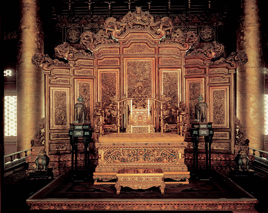 La Cité interdite se divise en deux grandes parties, la Cour extérieure et la Cour intérieure. Les trois salles principales de la Cour extérieure — la salle de l'Harmonie suprême, la salle de l'Harmonie parfaite et la salle de l'Harmonie préservée — en sont le centre; la salle de la Gloire littéraire, à l'est, et la salle des Prouesses guerrières, à l'ouest, étaient les lieux où se déroulaient proclamations de lois, convocations impériales et autres grandes cérémonies de cour. A l'arrière de la partie réservée aux trois grandes salles, commence la Cour intérieure. Elle comprend les trois palais de l'Arrière — le palais de le Pureté céleste (Qianqinggong), la salle de l'Union (Jiaotaidian), la salle de la Tranquillité terrestre (Kunninggong) — les six palais de l'Est et de l'Ouest (Dongxiliugong), et le Jardin impérial (Yuhuayuan). La Cour intérieure était à la fois le lieu de vie et de travail de l'empereur, et le lieu de résidence de la famille impériale.