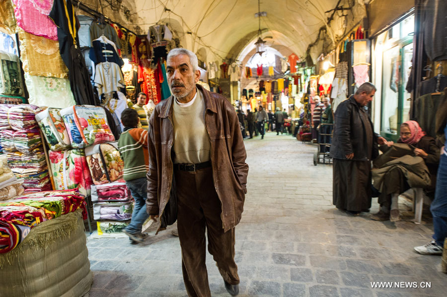 La photo documentaire prise le 19 janvier 2012 montre un marché dans la vieille ville d'Alep, en Syrie. (Xinhua/Li Muzi)