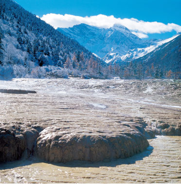 Les dépôts de travertin qui parsèment la surface de la vallée du Dragon jaune sont sans nul doute sa caractéristique la plus singulière. Ces dépôts s'accumulent pour former de véritables digues de travertin, créant ainsi des sortes de compartiments que l'on appelle des « bassins multicolores », et qui peuvent atteindre une surface très étendue. Au cœur de la vallée serpente ainsi un banc de travertin de 2 500 m de long, offrant le spectacle d'un sol « revêtu d'un manteau de sable d'or ». Brillant à travers la vallée toute entière, il évoque un dragon jaune géant descendu des glaciers, d'où le nom de « vallée du Dragon jaune ».