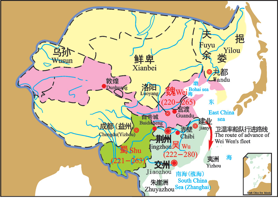 Après la bataille de Chibi , la situation changea .Cao Cao fut repoussé au Nord. Après sa mort, en 220, son fils Cao Pi déposa Han Xiandi et se proclama empereur de Wei, avec comme capitale Luoyang. Liu Bei occupa la plus grande partie du territoire de Jingzhou puis se dirigea vers l’ouest. En 221, il se proclama empereur de Shu, avec Chengdu comme capitale. Après avoir consolidé sa position sur les cours moyen et inférieur du Chang Jiang, Sun Quan se proclama, en 222, roi de Wu avec comme capitale Jianye (actuelle Nanjing, Jiangsu). L’existence de trois royaumes rivaux prit fin en 280 quand la dynastie des Jin occidentaux mit un terme au royaume Wu.