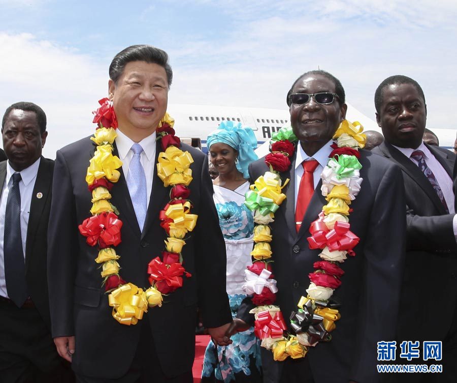Le président zimbabwéen Robert Mugabe accueille le président chinois Xi Jinping à l'aéroport de Harare au Zimbabwe, le 1er décembre 2015. (Xinhua/Lan Hongguang)