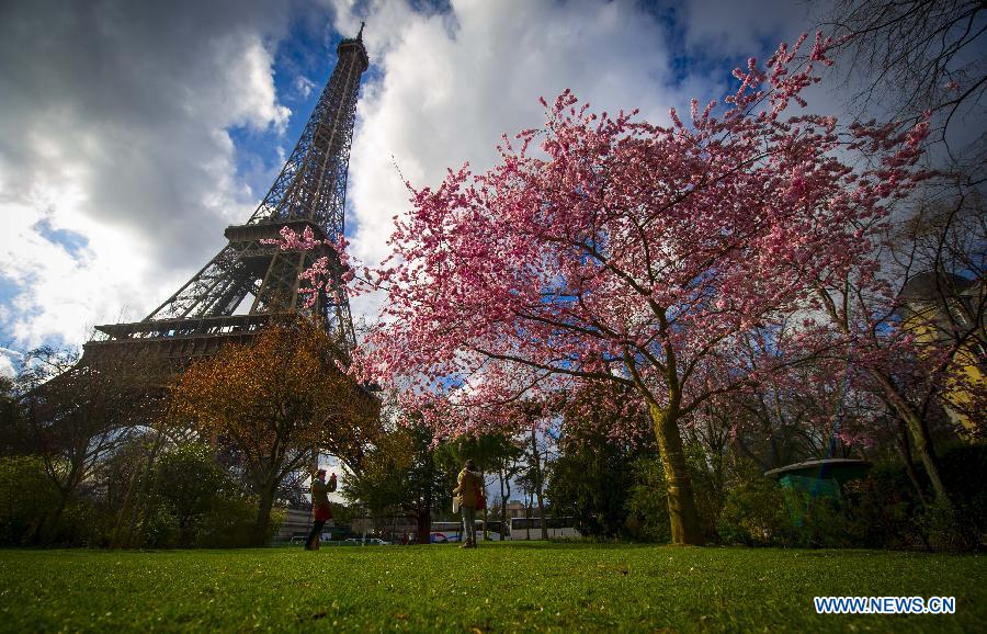 Des touristes prennent des photos près de la Tour Eiffel à Paris, capitale française, le 28 mars 2015. (Xinhua/Chen Xiaowei)