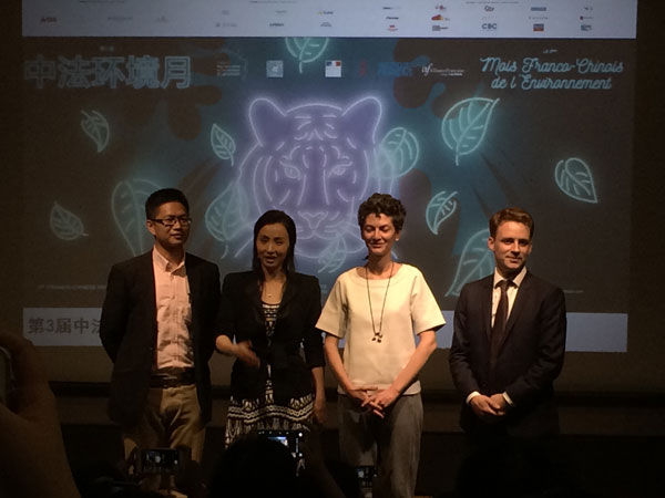 Matthieu Berton (1er à droite), attaché de coopération technique du secteur environnement, patrimoine et développement durable de l'Ambassade de France en Chine, et l'actrice chinoise Tao Hong (2e à gauche), ambassadrice du 3e Mois franco-chinois de l'environnement, assistent à la conférence de presse, organisée lundi à Beijing. (Photo: Wu Changrong)