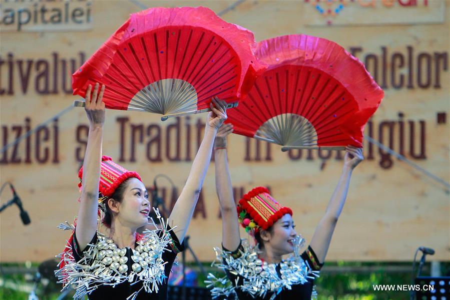 Des artistes du Groupe artistique Jin Xiaofeng du Yunnan de la Chine donnent un spectacle lors du Festival folklorique international à Bucarest en Roumanie le 30 juin, 2018. Le 12e Festival folklorique international, qui s’est ouvert vendredi, attire les artistes venus de Roumanie, de Bulgarie, de Chine et d’autres pays et régions.(Xinhua/Cristian Cristel)