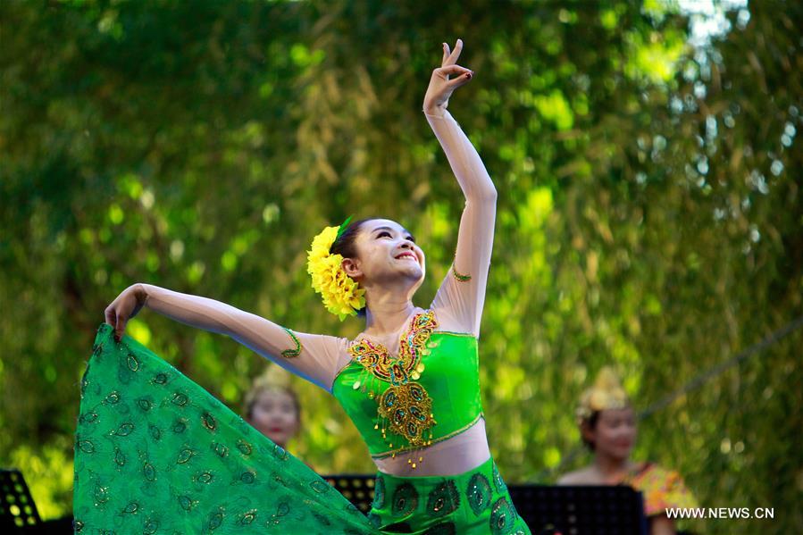 Une artiste du Groupe artistique Jin Xiaofeng du Yunnan de la Chine donne une représentation lors du Festival folklorique international à Bucarest en Roumanie le 30 juin, 2018. Le 12e Festival folklorique international, qui s’est ouvert vendredi, attire les artistes venus de Roumanie, de Bulgarie, de Chine et d’autres pays et régions.(Xinhua/Cristian Cristel)