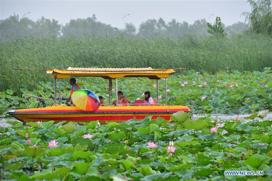 Des touristes admirent les fleurs de lotus en bateau sur le lac Longhu dans le district de Huaiyang, dans la province chinoise du Henan (centre), le 9 juillet 2018. (Xinhua/Feng Dapeng)