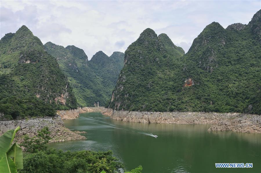 Photo aérienne prise le 16 juillet 2018 montrant un yacht touristique navigant dans le site pittoresque de Wanfenghu à Xingyi, dans la province chinoise du Guizhou (sud-ouest). (Xinhua/Ou Dongqu)