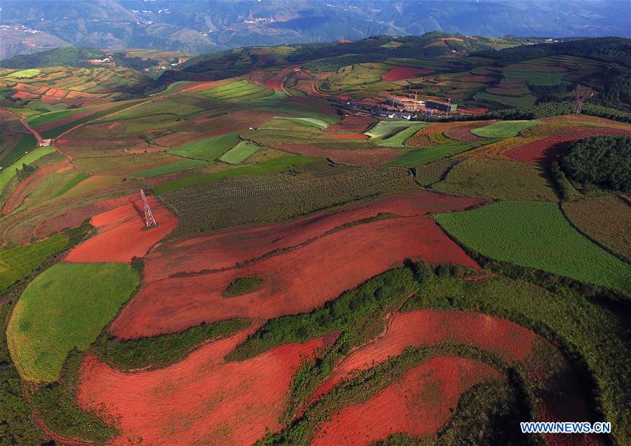 DONGCHUAN, 30 août (Xinhua) -- Paysage de terre rouge dans l'arrondissement de Dongchuan de la ville de Kunming, capitale de la province du Yunnan (sud-ouest de la Chine), le 29 août 2018. (Photo : Yang Zongyou)