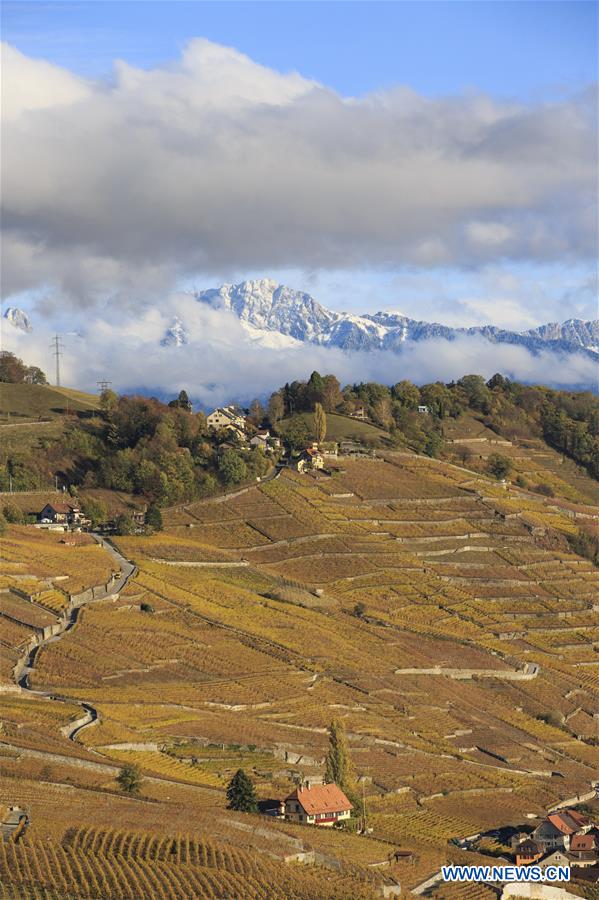 La photo prise le 30 octobre 2018 montre le paysage d'automne dans les vignobles à Lavaux, en Suisse. Les vignobles en terrasses de Lavaux ont été inscrits sur la liste du patrimoine mondial de l'UNESCO depuis le 28 juin 2007. (Xinhua/Xu Jinquan)