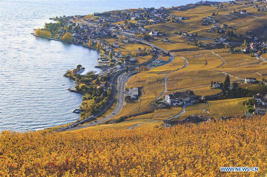 La photo prise le 30 octobre 2018 montre le paysage d'automne dans les vignobles à Lavaux, en Suisse. Les vignobles en terrasses de Lavaux ont été inscrits sur la liste du patrimoine mondial de l'UNESCO depuis le 28 juin 2007. (Xinhua/Xu Jinquan)