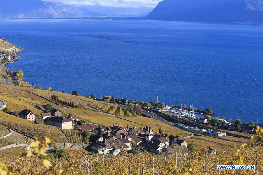 La photo prise le 30 octobre 2018 montre le paysage d'automne dans les vignobles à Lavaux, en Suisse. Les vignobles en terrasses de Lavaux ont été inscrits sur la liste du patrimoine mondial de l'UNESCO depuis le 28 juin 2007. (Xinhua/Xu Jinquan)