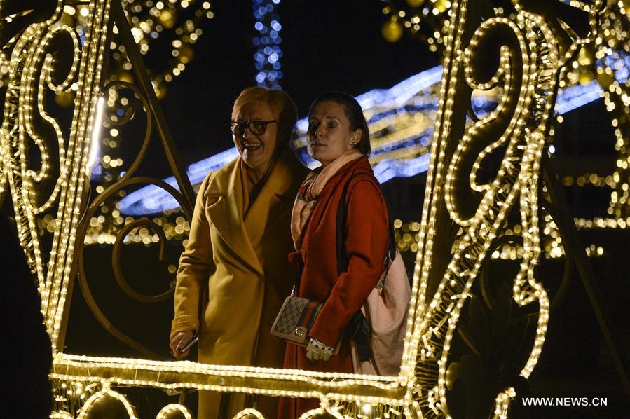 Des visiteuses posent pour des photos lors de l'exposition Jardin royal de la lumière au palais de Wilanów à Varsovie, en Pologne, le 6 novembre 2018. (Xinhua/Jaap Arriens)