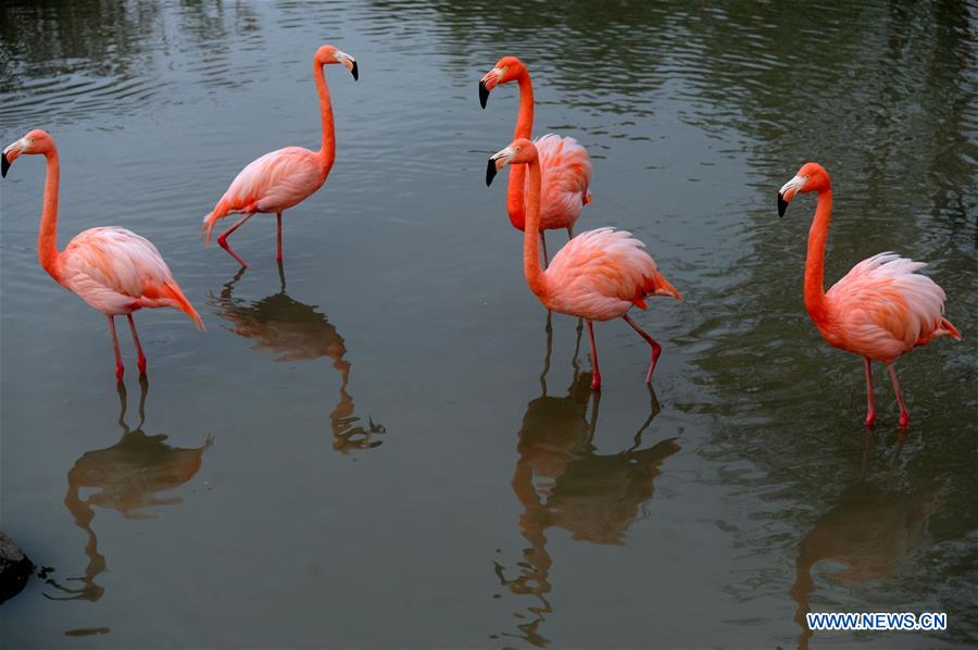 Photo prise le 8 novembre 2018 montrant des flamants roses dans un étang au zoo forestier de Shangfangshan à Suzhou, dans la province chinoise du Jiangsu (est). (Xinhua/Hang Xingwei)