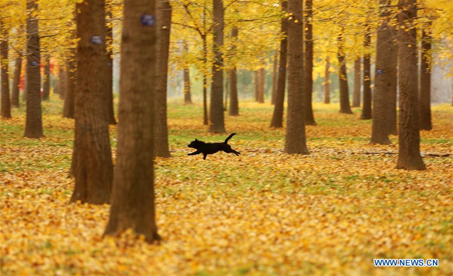 Un chien court dans une forêt de ginkgo au village de Jiawan du district de Tancheng, à la ville de Linyi, dans la province chinoise du Shandong (est), 13 novembre 2018. (Xinhua/Zhang Chunlei)
