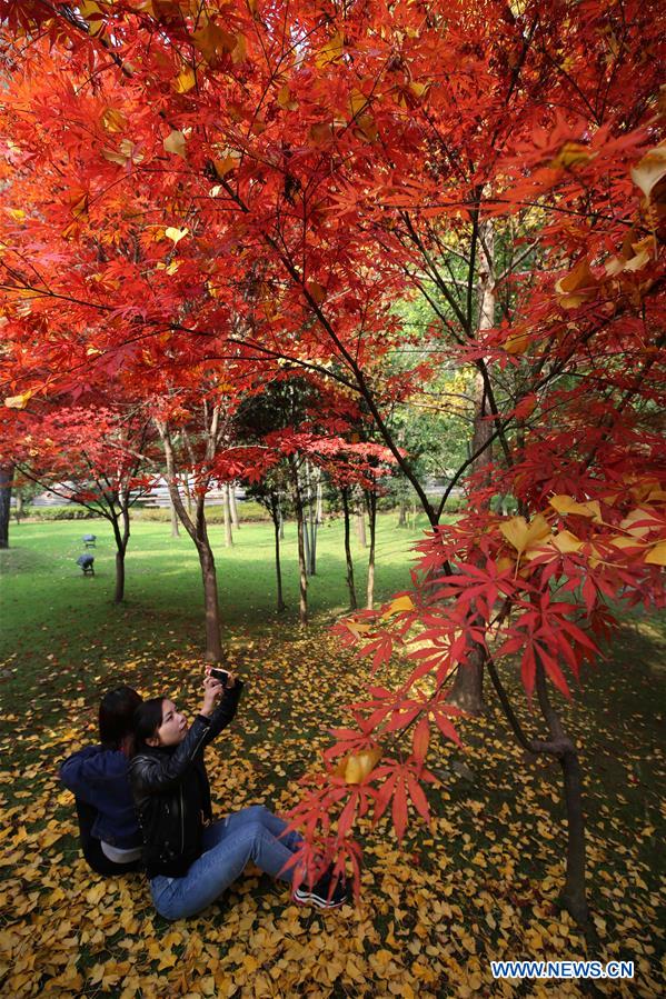 Des touristes admirent des feuilles d'érable au site touristique de Huanglongdong à Zhangjiajie, dans la province du Hunan (centre de la Chine), le 22 novembre 2018. (Xinhua/Wu Yongbing)