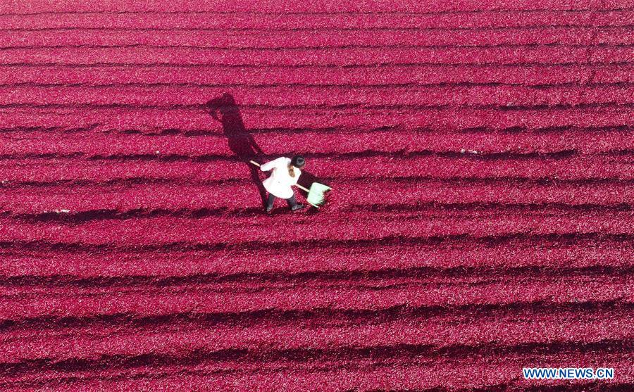 Une femme fait sécher les piments au soleil dans un village à Tangshan, dans la province chinoise du Hebei (nord), le 4 décembre 2018. (Xinhua/Liu Mancang)