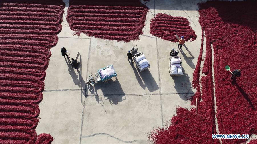 Photo aérienne prise le 4 décembre 2018 montrant des agriculteurs faisant sécher les piments dans un village à Tangshan, dans la province chinoise du Hebei (nord). (Xinhua/Liu Mancang)