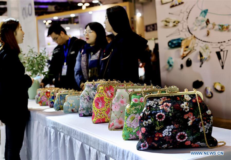 SHANGHAI, 8 décembre (Xinhua) -- Des visiteurs regardent des sacs en toile faits à la main lors du 4e Salon de l'artisanat international de Shanghai, le 7 décembre 2018. Plus de 300 exposants chinois et étrangers ont participé à cet événement de trois jours, qui a ouvert ses portes vendredi à Shanghai. (Photo : Liu Ying)