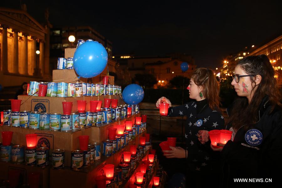 Des gens rassemblent autour d'un sapin de Noël spécial à Athènes, en Grèce, le 14 décembre 2018. Un sapin de Noël unique, entièrement composés de boîtes de lait, est mis en place pour la 9e année consécutivement par l'ONG "Doctors of the World" ( Médecins du monde ) au centre de la ville. Des enfants et des adultes ont visité la tente de Noël de cette ONG locale située près du bâtiment central de l'Université d'Athènes. Ils ont acheté des ornements et participé à diverses activités, contribuant ainsi à la collecte de lait, de conserves et de médicaments pour aider leurs concitoyens dans le besoin. (Xinhua/Marios Lolos)