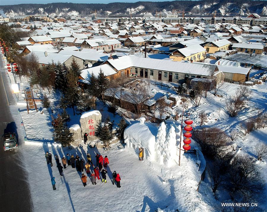 Des touristes visitent le village de Beiji à Mohe, dans la province chinoise du Heilongjiang (nord-est), le 16 décembre 2018. (Xinhua/Chu Fuchao)