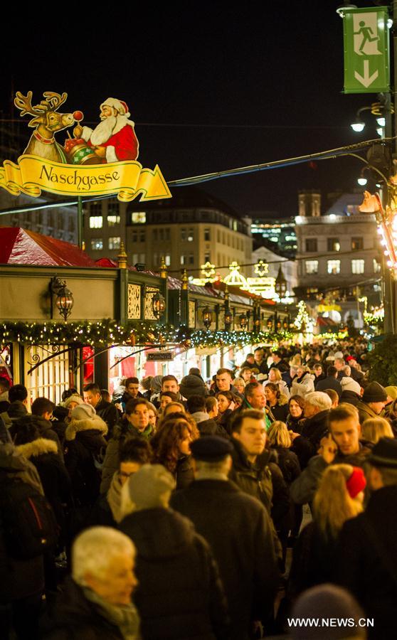 Des gens visitent un marché de Noël à Hambourg, en Allemagne, le 18 décembre 2018. Maintenant, il y a plus de 10 marchés de Noël à Hambourg, ce qui en fait une ville touristique d'hiver très célèbre en Allemagne. (Xinhua/Lian Zhen)