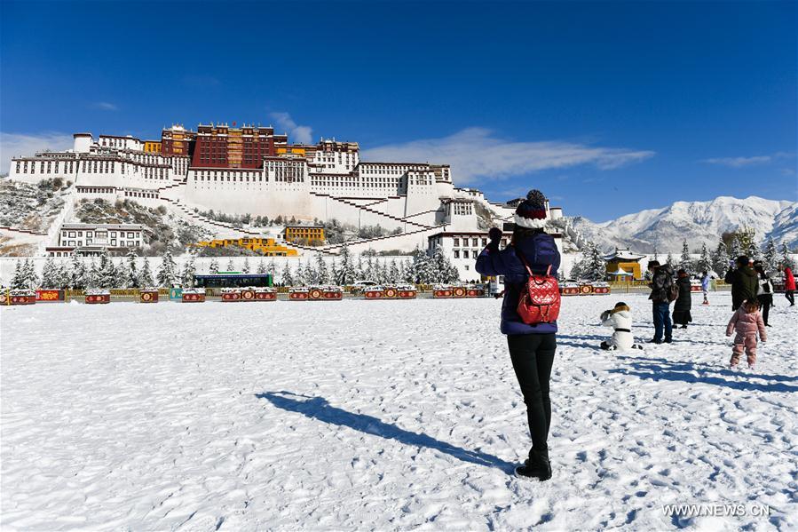 Une touriste prend des photos du palais Potala enneigé à Lhassa, chef-lieu de la région autonome du Tibet (sud-ouest de la Chine), le 19 décembre 2018. (Xinhua/Liu Dongjun)