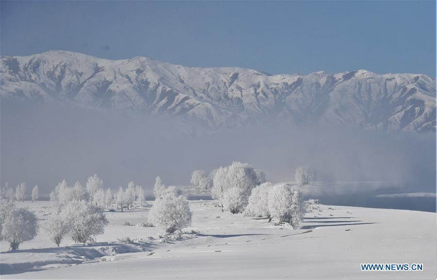 Photo prise le 23 décembre 2018 montrant le paysage de givre le long du fleuve Yarlung Zangbo dans la région autonome du Tibet (sud-ouest de la Chine). (Xinhua/Purbu Zhaxi)