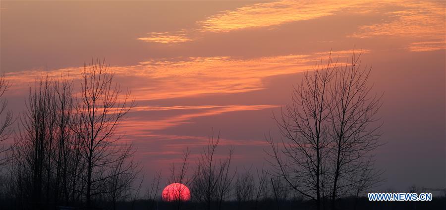Photo prise le 30 décembre 2018 montrant le paysage au coucher du soleil au bord de la rivière Shuhe dans le district de Tancheng à Linyi, dans la province du Shandong (est de la Chine). (Xinhua/Zhang Chunlei)
