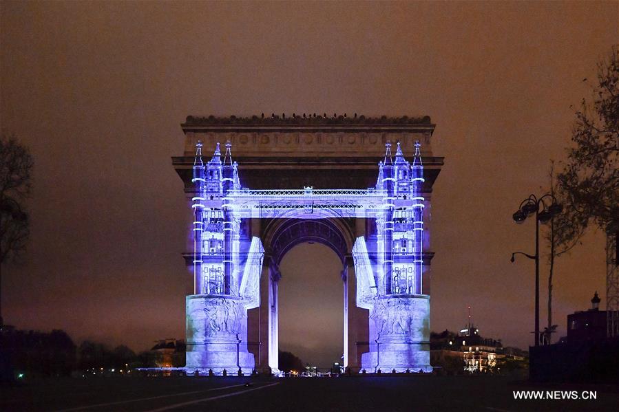 Un spectacle sur l'Arc de Triomphe pour célébrer le Nouvel an se tient à Paris, en France, le 1er janvier 2019. Depuis cinq ans, Paris fête le passage à la nouvelle année avec un spectacle son et lumière projeté sur la façade du célèbre monument parisien, suivi d'un feu d'artifice. Cette année, la thématique à l'honneur est la Fraternité. (Xinhua/Chen Yichen)