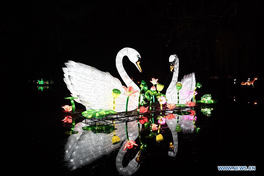 COLOGNE (ALLEMAGNE), 4 janvier (Xinhua) -- Des cygnes illuminés lors du Festival des lumières chinoises au zoo de Cologne, en Allemagne, le 3 janvier 2019. Le Festival se tient du 8 décembre 2018 au 20 janvier 2019, et présente plus de 50 oeuvres lumineuses. (Photo : Lu Yang)