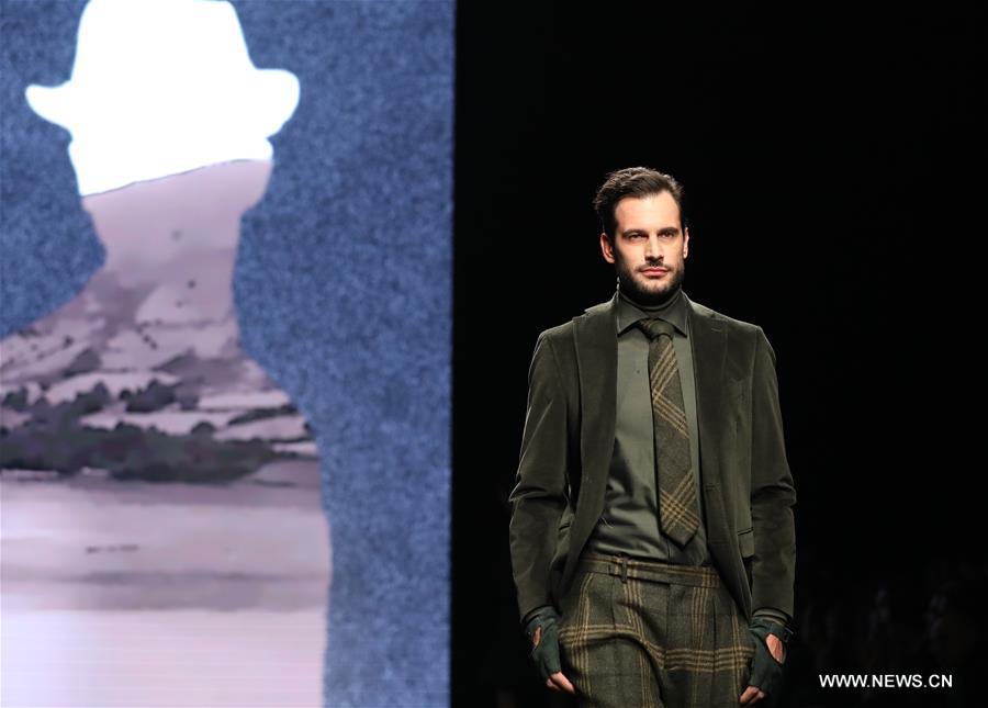 Un mannequin présente une création de DAKS lors de la semaine de la mode masculine de Milan à Milan, en Italie, le 13 janvier 2019. (Xinhua/Cheng Tingting)