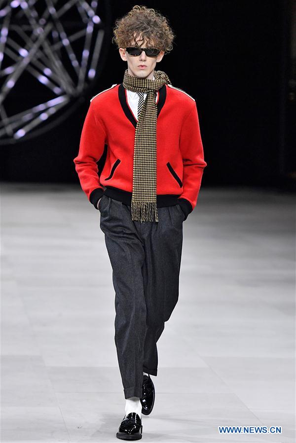 Un mannequin présente une création de la collection automne/hiver 2019/2020 de Celine lors de la semaine de la mode masculine de Paris, en France, le 20 janvier 2019. (Xinhua/Piero Biasion)
