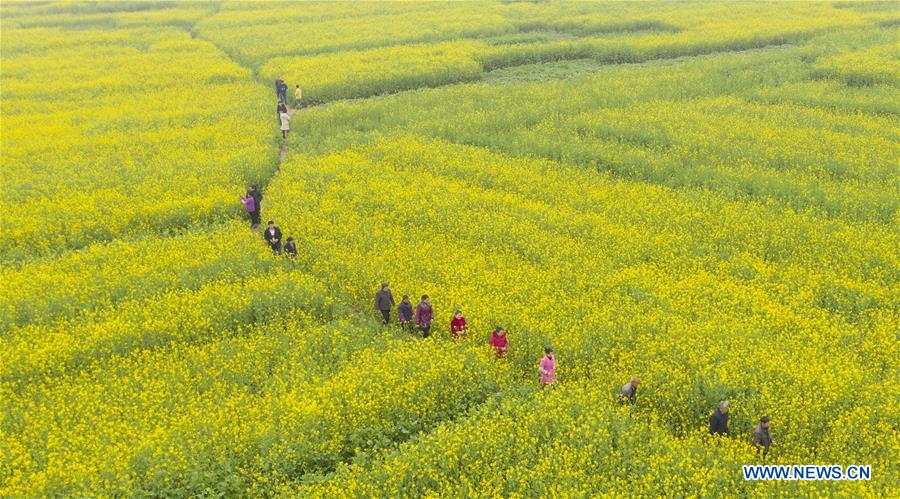 Photo aérienne prise le 26 février 2019 montrant des touristes marchant dans les champs de colza en fleurs dans le village de Longweizhou, à Xinyu, ville de la province du Jiangxi (est de la Chine). (Xinhua/Zhao Chunliang)