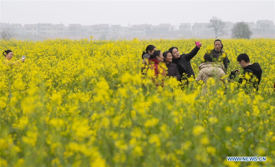 Des touristes prennent des selfies dans les champs de colza en fleurs dans le village de Longweizhou, à Xinyu, ville de la province du Jiangxi (est de la Chine), le 26 février 2019. (Xinhua/Zhao Chunliang)