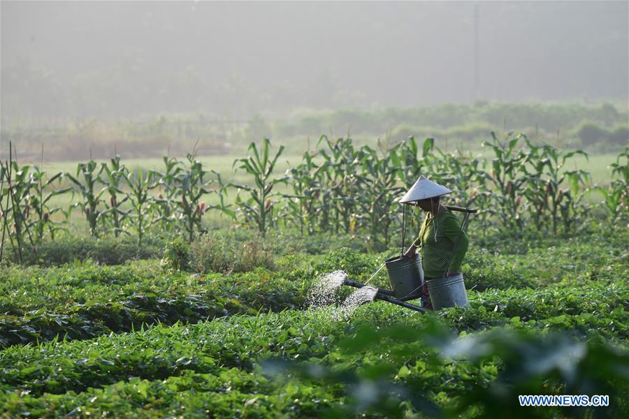 Une agricultrice arrose les champs au village de Qiaotou à Qionghai, dans la province de Hainan (sud de la Chine), le 28 février 2019. (Xinhua/Meng Zhongde)