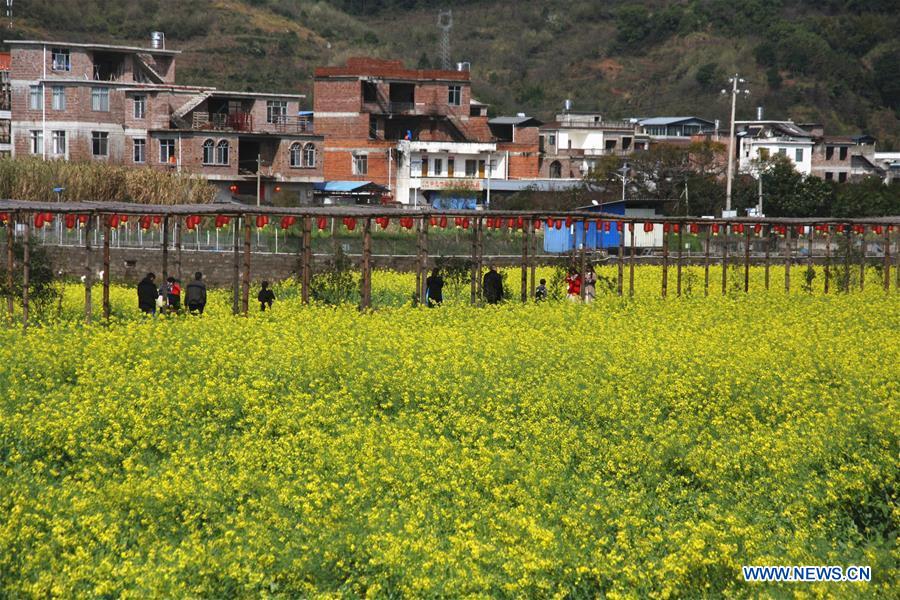 Des touristes admirent des fleurs de colza dans le village de Yuewan à Guilin, dans la région autonome Zhuang du Guangxi (sud de la Chine), le 3 mars 2019. (Xinhua/Zheng Zhimin)