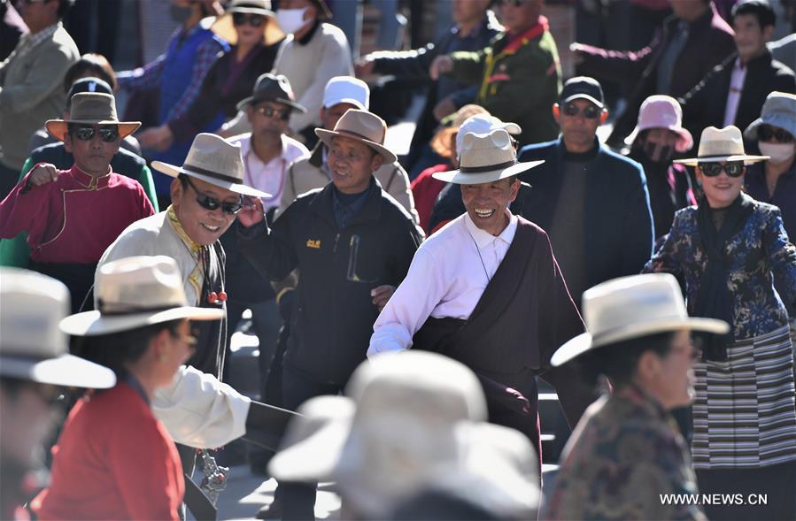 LHASSA, 11 mars (Xinhua) -- Des habitants locaux dansent dans un parc près du Palais du Potala à Lhassa, capitale de la région autonome du Tibet (sud-ouest de la Chine), le 10 mars 2019. (Photo : Li Xin)