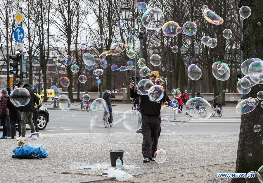 Un artiste fait des bulles de savon près de la porte de Brandebourg à Berlin, capitale de l'Allemagne, le 12 mars 2019. (Xinhua/Shan Yuqi)