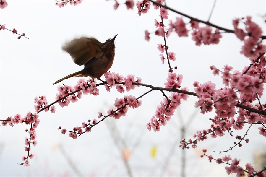 Photo prise le 14 mars 2019 montrant un oiseau sur un arbre en fleurs dans un jardin écologique à Zunyi, dans la province chinoise du Guizhou (sud-ouest). (Xinhua/Mu Mingfei)