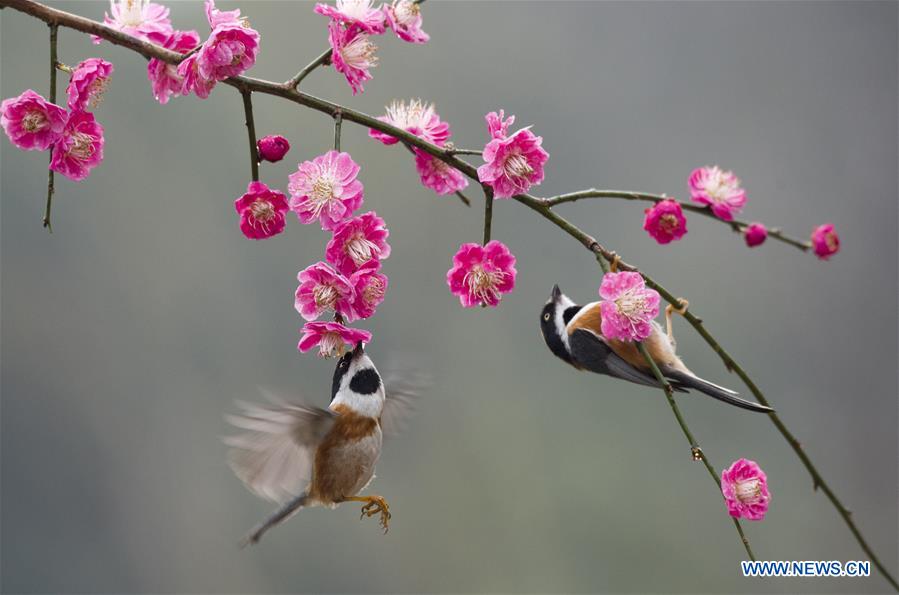 Des oiseaux se rassemblent autour de fleurs de prunier à Wuxi, dans la province chinoise du Jiangsu (est), le 18 mars 2019. (Xinhua/Pan Zhengguang)