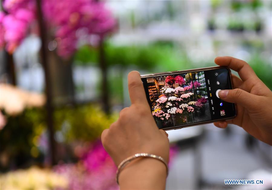 Un visiteur prend une photo lors de la 125e Foire des importations et des exportations de Chine, aussi connue sous le nom de Foire de Canton, à Guangzhou, capitale de la province méridionale du Guangdong, le 23 avril 2019. La foire, qui se déroule du 15 avril au 5 mai, s'organise en trois étapes. La deuxième étape actuelle, du 23 au 27 avril, est dédiée aux produits de consommation, de décoration et aux cadeaux. (Xinhua/Deng Hua)