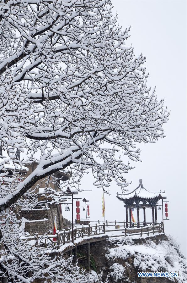Photo prise le 27 avril 2019 montrant un village de falaise couvert de neige dans la zone pittoresque du mont Luya à Xinzhou, ville de la province chinoise du Shanxi (nord). (Xinhua/Cao Jianguo)