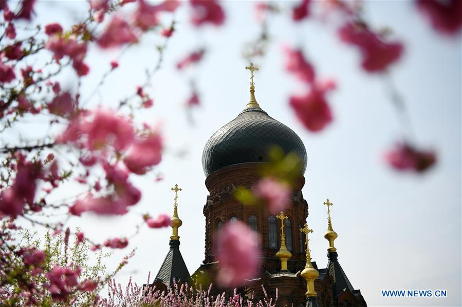Photo prise le 29 avril 2019 montrant des fleurs épanouies et la cathédrale Sainte-Sophie, à Harbin, capitale de la province chinoise du Heilongjiang (nord-est). (Xinhua/Wang Jianwei)